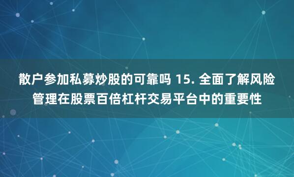 * **监管合规:**选择受证监会或其他监管机构监管的平台散户参加私募炒股的可靠吗,确保其合法合规。